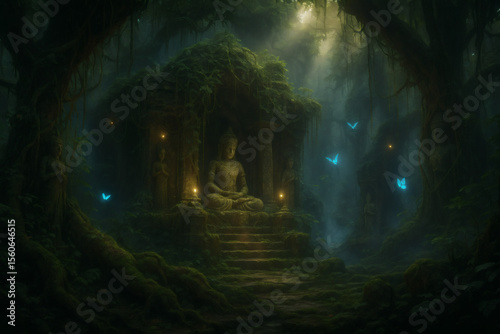 forest, sanctuary, buddha, statue, ancient, mystical, enchanted, nature, temple, spiritual, meditation, calmness, serene, peaceful, jungle, greenery, vine, foliage, sunlight, ray, butterfly, glowing, aethereal, mysterious, hidden, sacred, zen, calm, harmony, retreat, shrine, moss, historical building, oasis, heritage, game, video game, concept, art