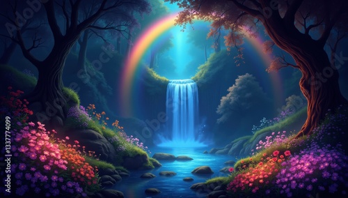 magical, enchanted, forest, glowing, flower, dreamy, rainbow, arch, mystical, waterfall, vibrant, fantasy, colours, serene, nature, beauty, serenity, landscape, illumination, idylli, tranquil, scene, flora, fauna, light, dreamlike, harmony, adventure, retreat, escape, fairy tale, picturesque, lush, colourful, atmosphere, enchanting, wonder, exploration, charme, visual, aethereal, secret, peaceful, mystery, sunlight, calmness