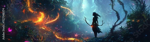 Enchanted Forest with Mystic Figure Surrounded by Glow and Nature