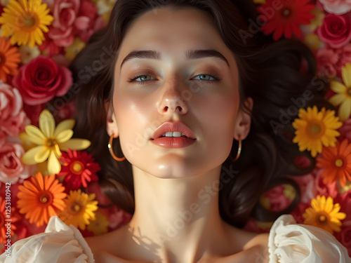 Enchanted in Bloom: A dreamy close-up of a woman lying among a sea of colorful flowers, her face softly illuminated by natural light.