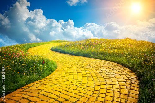 journey, adventure, imagination, wonder, landscape, vibrant, wildflower, blue skies, cloud, sunlight, colourful, pathway, magical, mysterious, enchanting, whimsical, picturesque, inspiration, exploration, fantasy, enchanted, storytelling, scenic beauty, nostalgia, aethereal