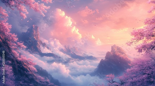 mountain, cloud, sky, pink, sunset, cherry, blossom, flower, tree, nature, landscape, scenic, view, beautiful, serene, peaceful, calm, tranquil, dreamy, fantasy, magical, whimsical, artistic, digital, art, painting, illustration, image, picture, photo, aesthetic, pretty, lovely, gorgeous, amazing, breathtaking, heavenly, paradise, wonderland, spring