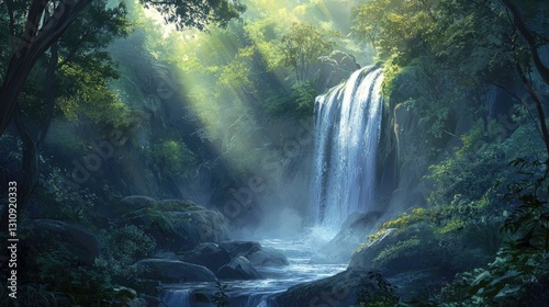 waterfall, forest, nature, jungle, tropical, water, cascade, rock, tree, leaf, green, sunlight, stream, river, landscape, scenic, view, beautiful, serene, calm, peaceful, tranquil, mist, lush, vibrant, fresh, paradise, hidden, magical, mystery, wonder, escape, renewal, rejuvenation, healing, peace, quiet, harmony, meditation, relaxation, photo