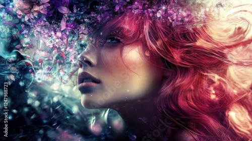 woman, portrait, fantasy, hair, art, digital, beauty, red, pink, purple, blue, green, light, glow, colours, whimsical, dreamy, enchanted, magical, mystical, flower, nature, abstract, surreal, artistic, creative, imagination, vision, intricate, feminine, elegant, graceful, radiant, serene, peaceful, calm, intense, vibrant, stylish, expression, face