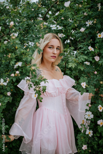 beauty, blond, bloom, blossom, bush, charming, dreamy, dress, elegance, fashion, feminine, floral, flower, foliage, garden, graceful, greenery, leaf, magical, model, moody, natural, nature, peaceful, flower petals, pink, portrait, romantic, rose, sensual, serene, soft, spring, style, sunlight, tattoo, vibrant, wildflower, woman