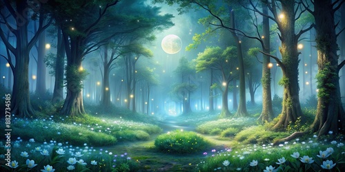 ancient, forest, moonlight, luminescent, flora, enchanting, atmosphere, mystical, magical, fantasy, nature, moon, tree, greenery, glowing, aethereal, whimsical, tranquil, peaceful, serene, dreamy, surreal, wilderness, mysterious