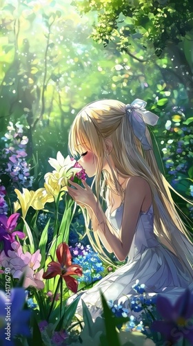 Enchanting Anime Girl: A Blossom Kiss Amidst a Flower Garden