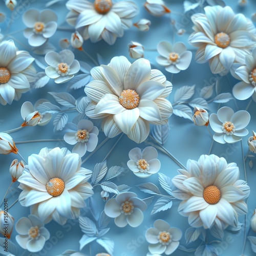 Enchanting Artistry of Felt Daisy Flowers and Vines on a Serene Blue Background