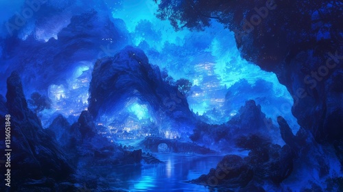 fantasy, landscape, city, hidden, moonlit, night, blue, magical, mystical, enchanted, dreamlike, surreal, rock, mountain, cave, river, water, bridge, tree, forest, glow, light, illumination, artwork, digital artwork, illustration, painting, vibrant, colourful, serene, peaceful, tranquil, mysterious, secret, adventure, exploration, imaginary, unreal, beautiful, stunning, breathtaking, wallpaper, background, scene, setting