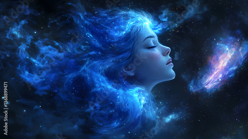 enchanting, cosmic, aethereal, girl, flowing, blue, hair, dreamy, atmosphere, illustration