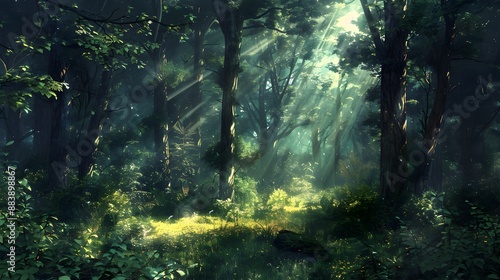 Enchanting forest clearing with dappled sunlight filtering through dense trees, creating a serene and magical ambiance.