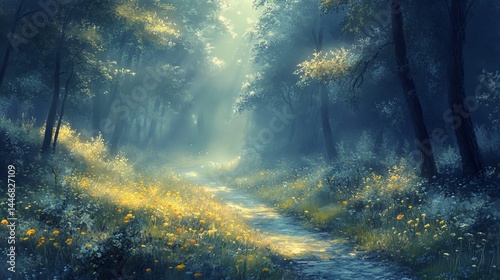 forest, path, painting, nature, tree, greenery, exploration, calmness, landscape, scenery, art, outdoors, wilderness, beauty, serene, peaceful, element, light, depth, colours, vibrant, environment, wildlife, hiking, journey