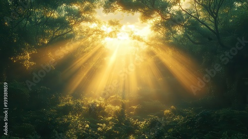 enchanting forest scene with golden sunbeams piercing through a canopy of lush green leaves creating a magical interplay of light and shadow on the misty forest floor