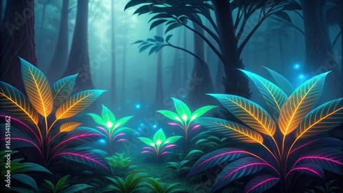 Enchanting glowing plants illuminate a vibrant, magical forest landscape at twilight creating a serene scene