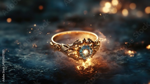 Enchanting golden ring with a blue gem surrounded by sparkles and glowing effects in a mysterious atmosphere