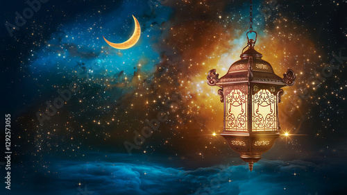 night sky, star, crescent moon, lantern, warm light, deep blue, cosmos, foreground, chain, surface, celestial, illumination, calmness, night, beauty, nature, magic, dreamlike, aethereal, peaceful, wonder, exploration, universe, astronomy, fantasy, serenity, artistic, atmospheric