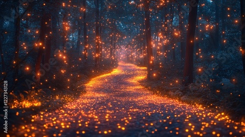 Enchanting Night Pathway Through a Mystical Forest Filled with Glowing Fireflies and Sparkling Lights
