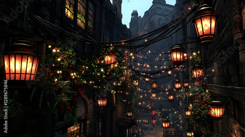 street, night, lantern, light, city, evening, old, building, holiday, christmas, festive, warm, cosy, romantic, magical, dark, shadow, architecture, urban, glowing, illuminated, decoration, garland, vintage, mediaeval, european, cobbled, winter, season, celebration, festival, atmosphere, ambience, mood, perspective, street light, hanging, glow, orange, red, yellow, background, scenic, view