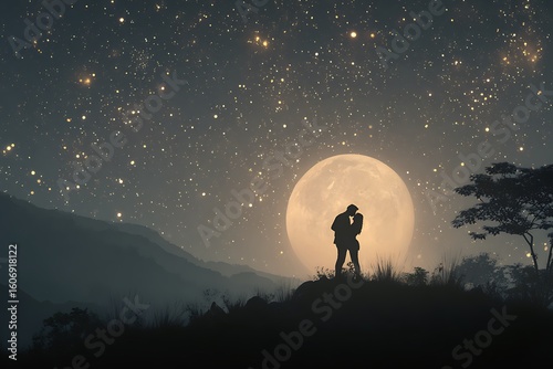 love, romance, couple, hugs, kiss, silhouette, moon, moonlight, night, star, starry, sky, celestial, cosmic, universe, galaxy, dream, fantasy, magic, aethereal, serene, peaceful, calm, tranquil, nature, landscape, mountain, hill, people, human relationships, connection, intimacy, together, oneness, harmony, passion, emotion, feeling, romantic, beautiful, stunning, magical, dreamy, atmospheric, wonder, awe, breathtaking, enchanting