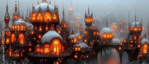 city, gothic, architecture, snow, winter, night, light, illumination, fantasy, magical, fairy tale, town, building, castle, bridge, river, dark, mysterious, romantic, dreamy, scenic, landscape, artwork, illustration, art, digital, mediaeval, old, ancient, structure, glowing