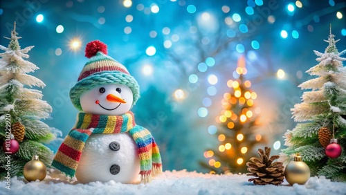 snowman, christmas, tree, bokeh, winter, holiday, festive, blue, cheerful, decoration, light, ornament, magic, scene, landscape, joyful, whimsical, celebration, outdoors, nature, seasonal, beauty, sparkle, atmosphere, cold, happiness, snow, tradition, family, fun, cosy, winter landscape, colourful, holiday season, enchanting, bright, twinkling, warmth, charme, artistry, creativity, imagination, delight, joy, love, peace, calmness