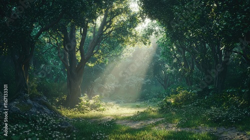 Enchanting sunlit forest landscape with lush greenery and tranquility
