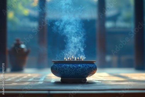 infuriated, smoke, relaxation, meditation, serene, calmness, blue, ceramic, dish, calm, environment, spiritual, aromatherapy, wellness, peaceful, atmosphere, swirl, bamboo, natural, indoor, space, mindfulness, ritual, calming, sharpened, soothing, ambience, home, decor, spirituality, fragrance, zen, retreat, container, essential, oil, scent, cone, material, balance, serenity, peace, practice, stillness, room, design, generative, ai