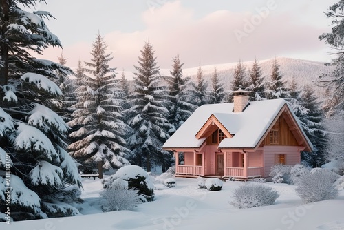 Enchanting Winter Tableau of Snow-Covered Pines and Cozy Cabins in Soft Pastel Tones and Textures