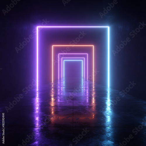 neon, light, tunnel, glowing, purple, orange, blue, pink, abstract, futuristic, modern, dark, background, wet, floor, geometric, shape, forever, perspective, hallway, corridor, portal, dimension, technology, digital, art, design, vibrant, colours, spectrum, electric, illumination, interior, pathway, endless