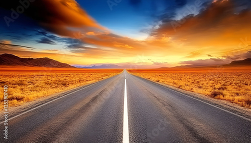 Endless highway during vibrant sunset with dramatic clouds over vast landscape