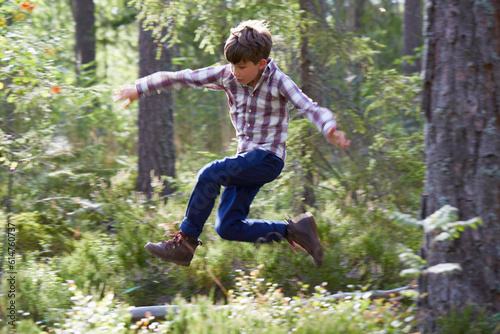 energetic, boy, jump, wood, agile, alone, arms outstretched, brunette, carefree, casual attire, children, childhood, clothes, copy space, day, elementary, energy, enjoy, enthusiastic, exhilaration, exuberant, freedom, full-length, fun, growth, jean, lifestyle, mid-air, motion, nature, 1, outdoors, people, person, plaid, shirt, half face, speed, summer, vitality