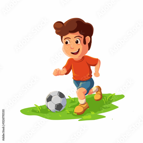 Energetic Cartoon Boy Playing Soccer on Green Field – Happy Child Kicking Football in Sports Activity – Fun and Engaging Vector Illustration for Kids, Sports, and Educational Content