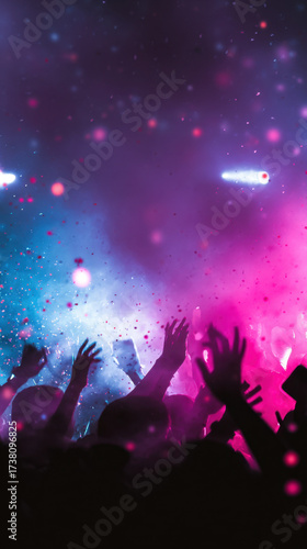 party, crowd, concert, nightclub, dancing, music, people, dj, festive, silhouette, light, fun, event, celebration, nightlife, energetic, festival, hands up, pink, blue, clubbing, dancefloor, show, entertainment, atmosphere, vibrant, excited, confetti, audience, disco, background, blur, live music, youth, blurred, dark, fog, stage, cheering, performance, rave, club, new year, laser, bright, purple, lifestyle