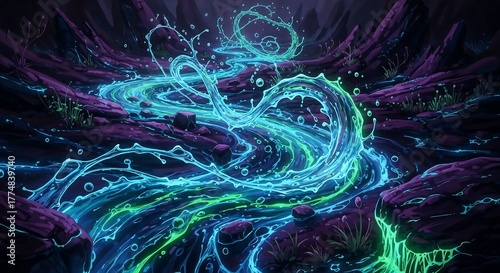 Energetic stream of turquoise light in chaotic motion.