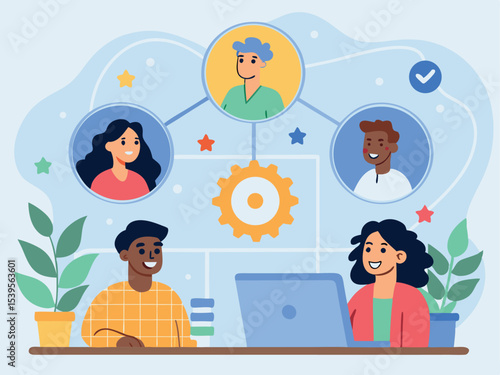 energetic, vector, design, remote, fun, employee, team, diverse, new, hire, character, navigating, interactive, platform, progress, bar, badge, collaborative, challenge, stylised, virtual, office, space, playful, engaging, inclusive, bright, colours, palette, team, building, skill, development, environment, art, technology, workplace, innovation, industry, element, supply, creative