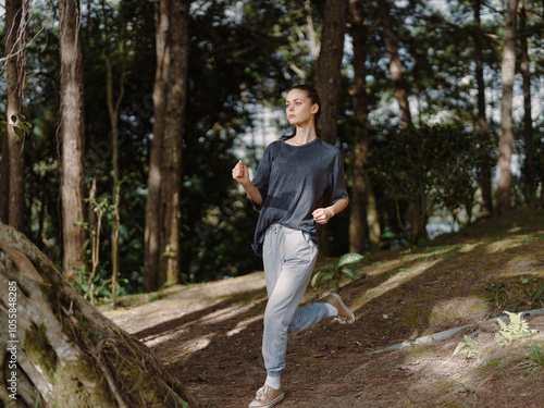 Energetic young woman jogging in a serene forest, wearing casual athletic attire, enjoying nature and fitness Healthy lifestyle and exercise concept
