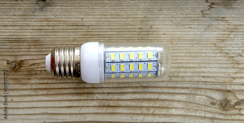 Energy saving LED light bulb on a wood background