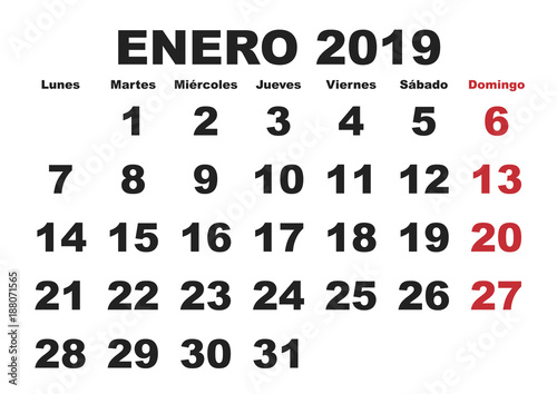 jan, year, 2019, wall, calendar, planner, month, spanish, scheduler, day, monday, tuesday, wednesday, th, friday, sunday, support, monthly, planning, appointment, organiser, date, week, weekly, render, holiday, weekend, concept, time, diary, schedule, page, future, sheet, office, daily, journal, paper, number, reminder, red, festive