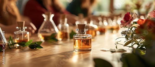 Engaging scene of a fragrant workshop featuring glass perfume bottles, lush greenery, and vibrant florals.