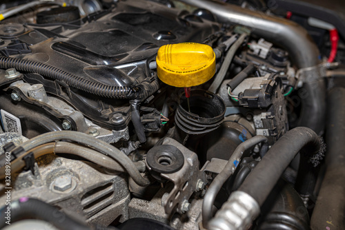 Engine compartment in used car visible open oil filler in yellow and parts of the engine.