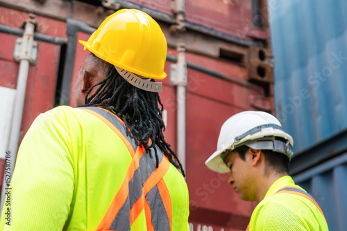Engineer and foreman dock worker team checking containers box at shipping yard
