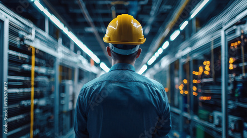 engineer, hard, hat, electrical, inspection, industrial, technology, cable, back, view, professional, safety, modern, workspace, lighting, equipment, maintenance, power, control, room, infrastructure, men at work, blue, shirt, network