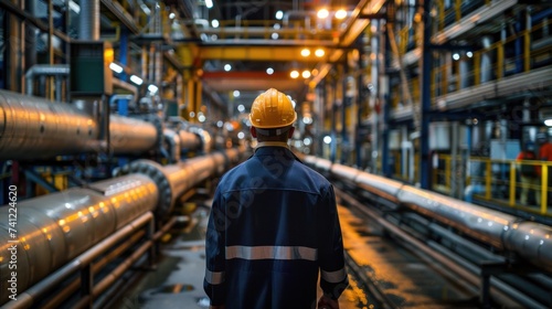 Engineer in oil blending factory, Inspection at steel long pipes and pipe elbow station oil at factory.