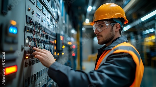 engineer, electrical, wiring, power, plant, safety, gear, control, room, system, check, maintenance, industrial, technology, energy, electricity, machinery, equipment, construction, factory, workplace, occupation, profession, helmet, glove, uniform, hard hat, protective, clothing, job, career, work, industry, business, commercial