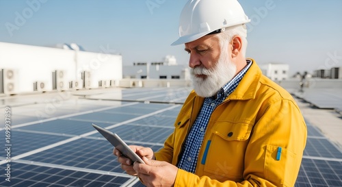 solar panel, engineer, inspection, renewable energy, solar energy, technology, energy, tablet, work, professional, man, helmet, rooftop, infrastructure, electricity, power, grid, system, alternative energy, construction, development, installation, maintenance, efficiency, sustainable, clean energy, environment, digital, monitoring, device, technician, project, industry, building, structure, outdoors, daylight, sky, climate change, green, future, innovation, expertise, solution, generation, senior