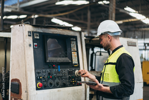 Engineer is working in the factory. Mechanical technicians are maintaining the engine.