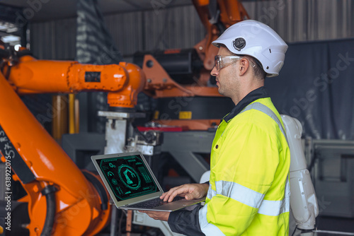 engineer male using laptop computer control operate industry robot arm machine. man programming welding robotic test checking service