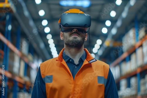 Engineer male using VR virtual reality technology in modern warehouse factory new innovation engineering