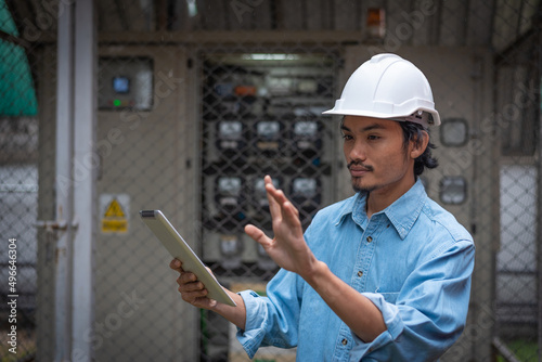 Engineer or Technician man using tablet with electrical control box in industrial plant, business and electrical industry concept.