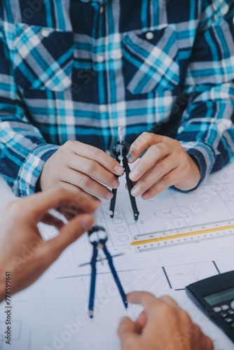 engineer people meeting working and pointing at a drawings in office for discussing. Engineering tools and construction concept.